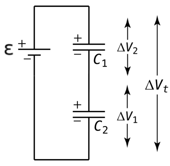 When the two capacitors are in series, the electric potential difference between the wire directly before the first capacitor and the wire directly after the second capacitor (which would be the wires connected to the terminals if there are no other components in the circuit) is equivalent to to the summed electric potential difference across the two capacitors. In short, as depicted below, Ɛ = ΔV1 + ΔV2, with Ɛ being ΔVset when there are more components in the circuit than just the two capacitors.
