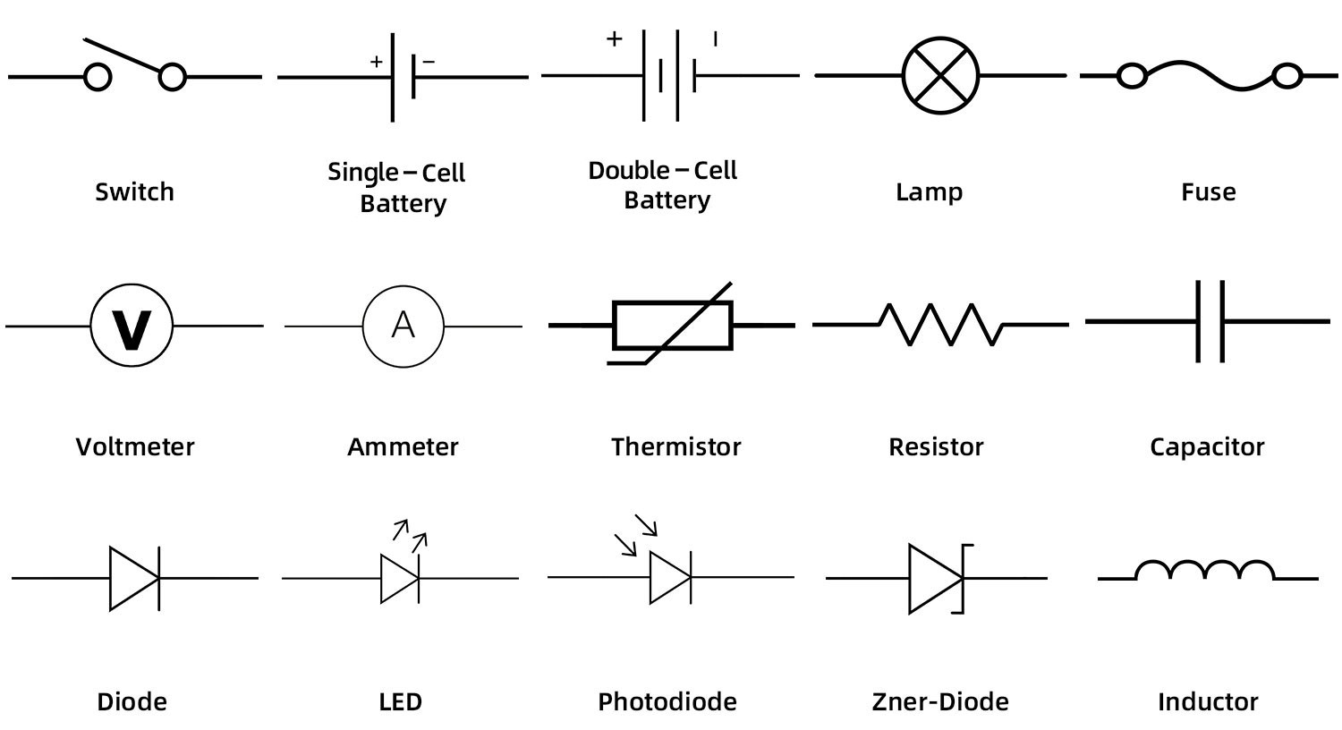 These components are all represented with their own symbols in circuit diagrams. The below illustration displays the most popularly used components in diagrams.