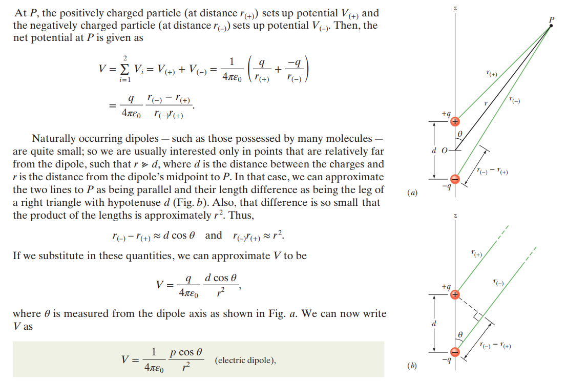The derivation of the given equation, which requires finding the net electric potential of the dipole system (as explained in Rule 204), is fairly rudimentary and is presented here in image form for those interested. Note that in the proof, point P is the test charge.