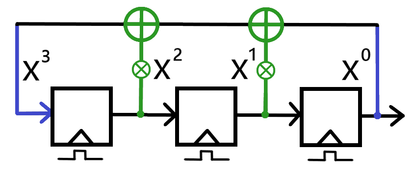 An illustration of how each variable of an LFSR polynomial accounts for the feedback path connections of an LFSR. The depicted LFSR has three flip-flops and both possible XOR gates, meaning that the polynomial has every variable present.