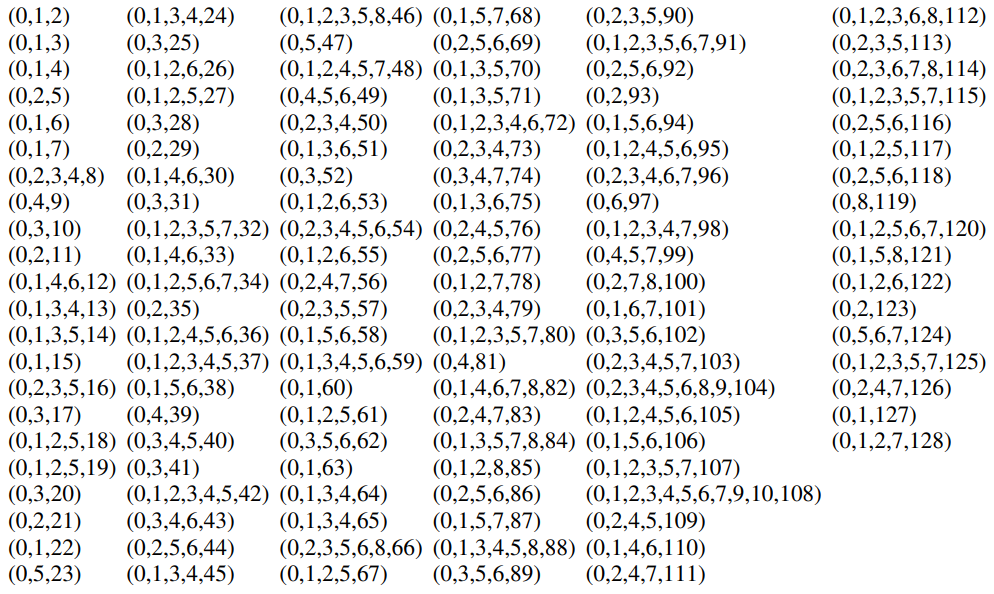 A table showcasing an example primitive polynomial for each m value 2-128.