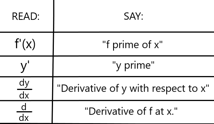 A "READ:", "SAY:" chart for f'(x), y', dy/dx, and d/dx.