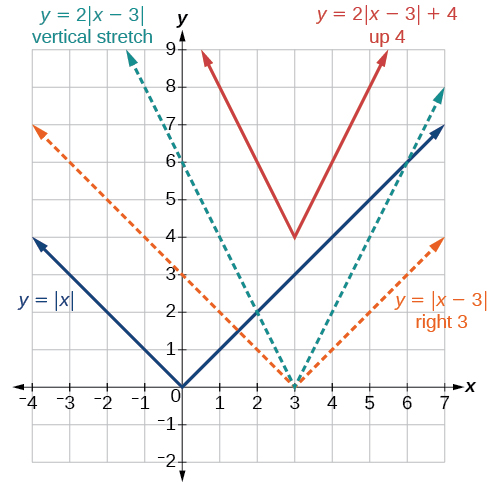 The absolute value function and its variations. Courtesy of Math LibreTexts.